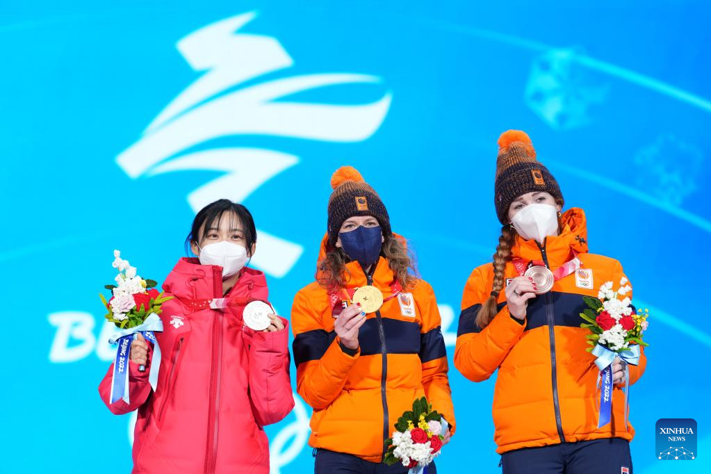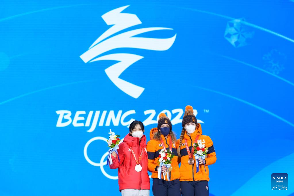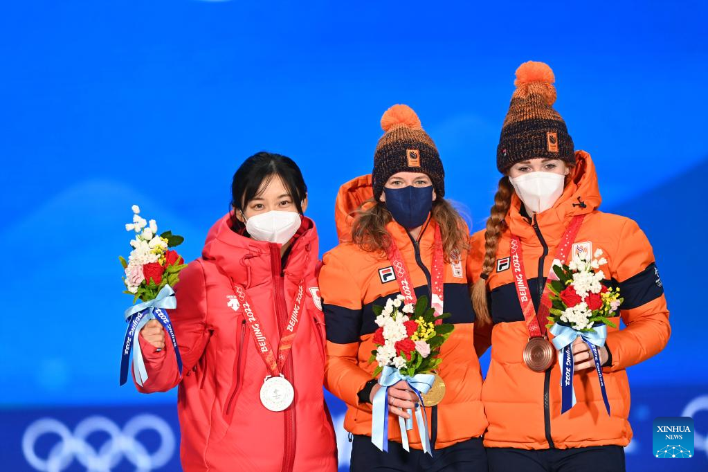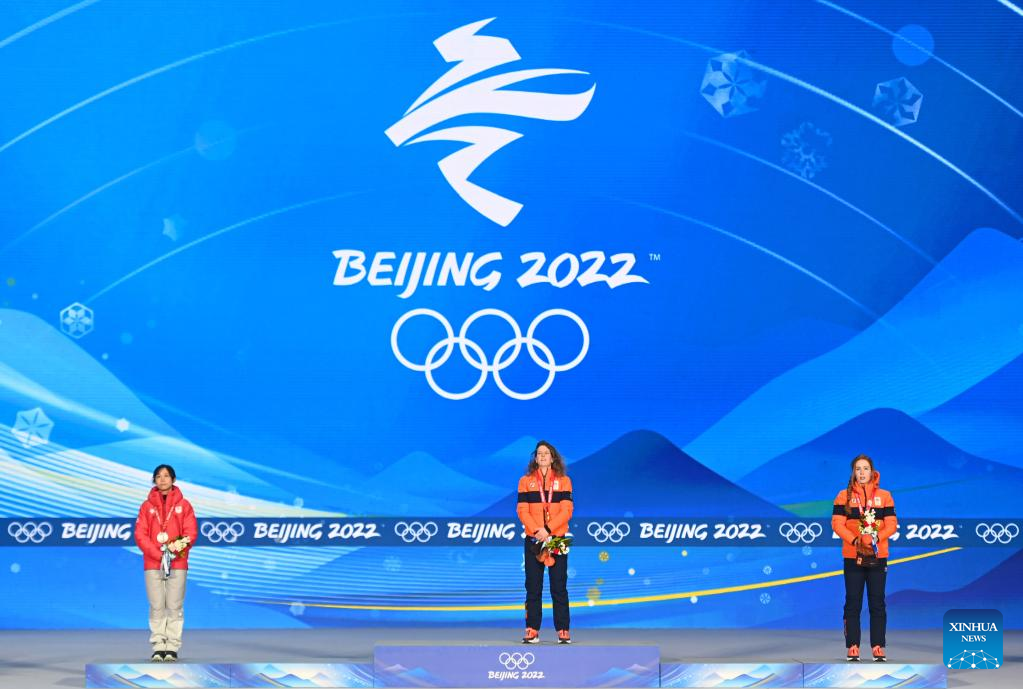 Gold medallist Ireen Wust (C) of the Netherlands, silver medallist Takagi Miho (L) of Japan and bronze medallist Antoinette de Jong of the Netherlands attend the awarding ceremony of women's 1,500m speed skating at the Beijing Medals Plaza of the Winter Olympics in Beijing, capital of China, Feb. 8, 2022. (Xinhua/Huang Zongzhi)