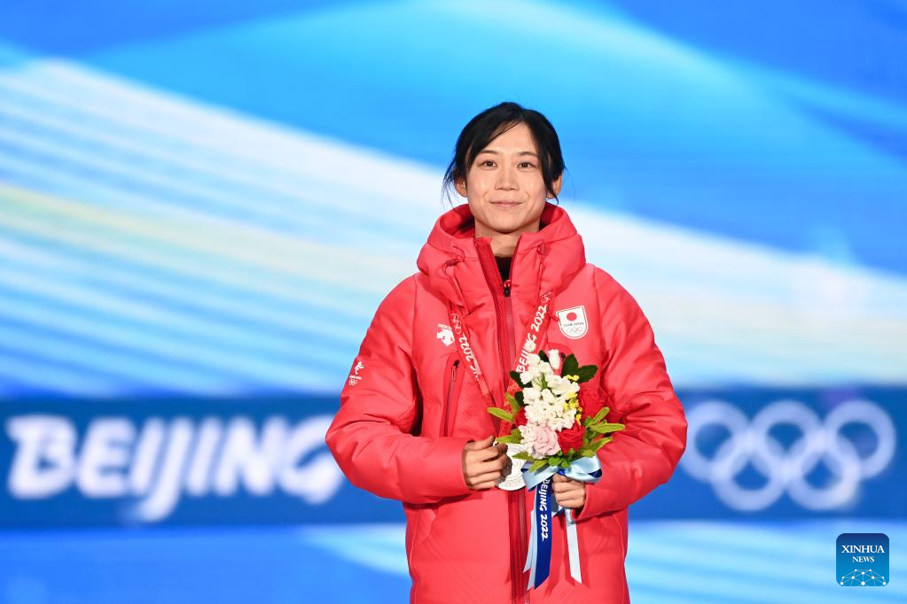 Silver medallist Takagi Miho of Japan poses for a photo during the awarding ceremony of women's 1,500m speed skating at the Beijing Medals Plaza of the Winter Olympics in Beijing, capital of China, Feb. 8, 2022. (Xinhua/Huang Zongzhi)