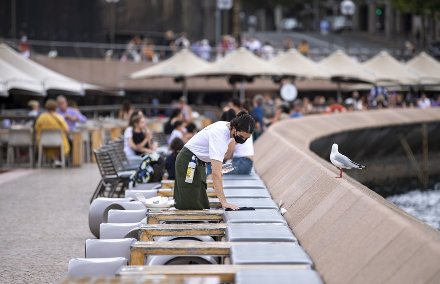 A waitress cleans a table at a restaurant near the Sydney Opera House in Sydney, Australia, on Jan. 9, 2022. (Xinhua/Bai Xuefei)
