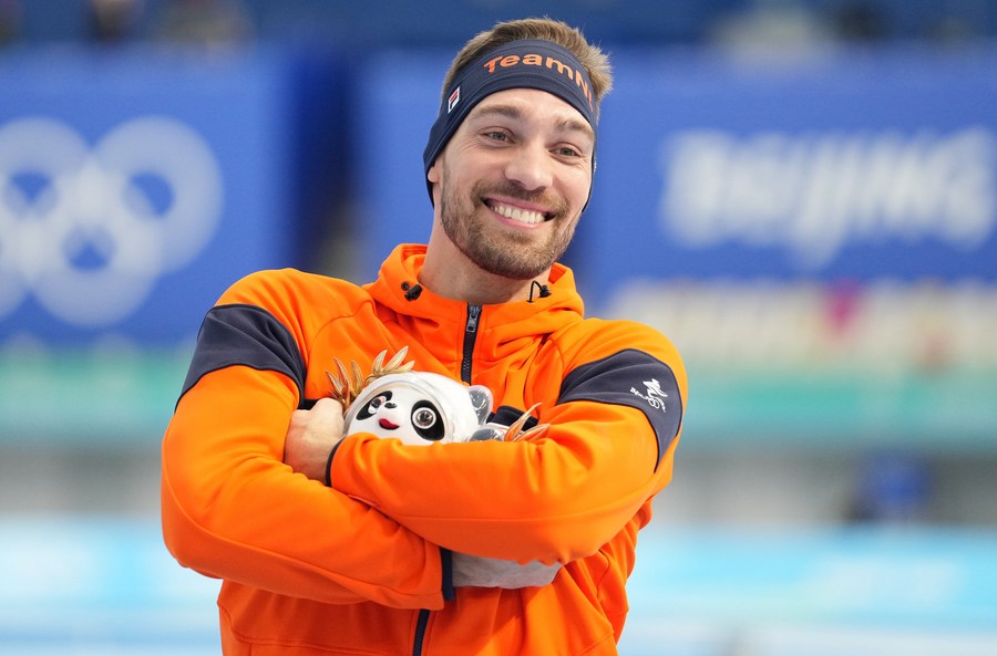 Kjeld Nuis of the Netherlands reacts after speed skating men's 1,500m event at the National Speed Skating Oval in Beijing, capital of China, Feb. 8, 2022. (Xinhua/Wang Fei)