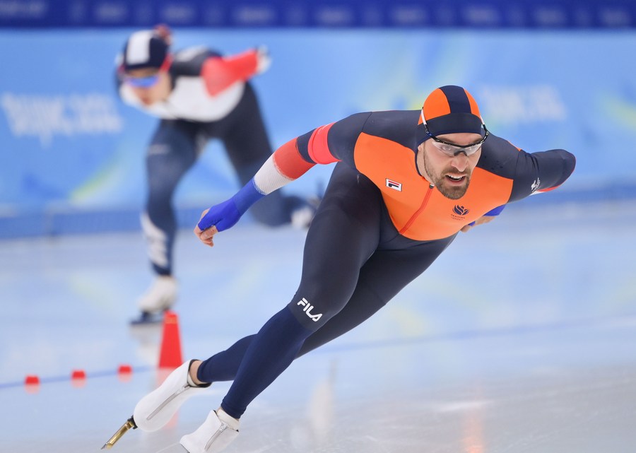 Kjeld Nuis of the Netherlands competes during the speed skating men's 1,500m event at the National Speed Skating Oval in Beijing, capital of China, Feb. 8, 2022. (Xinhua/Xue Yuge)