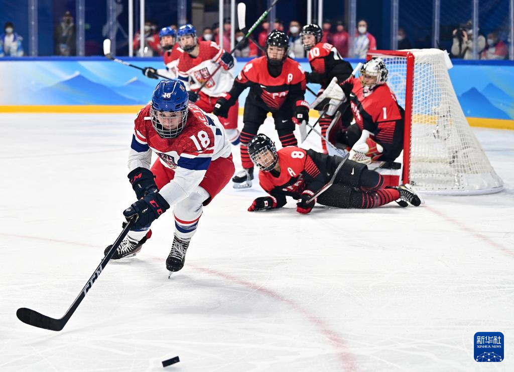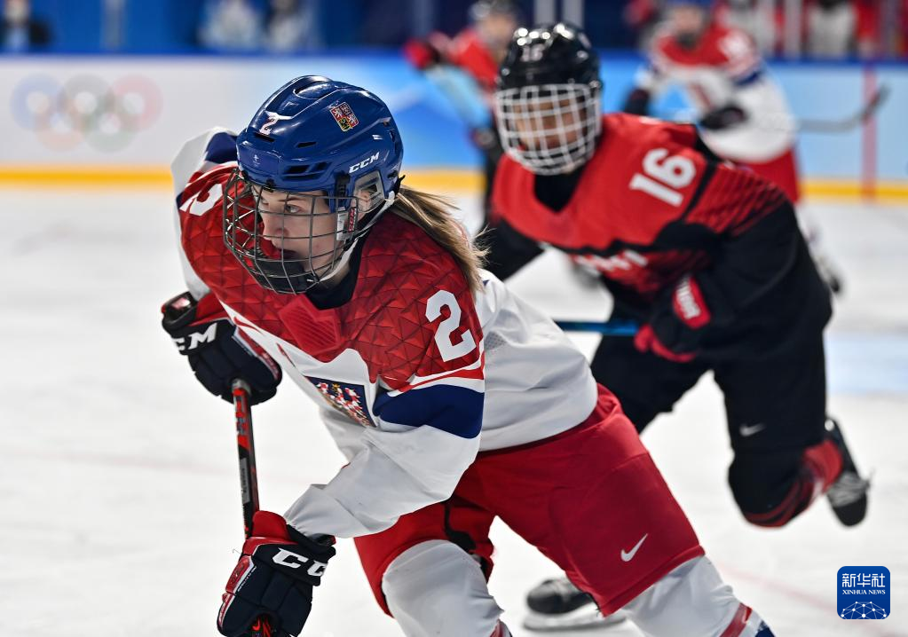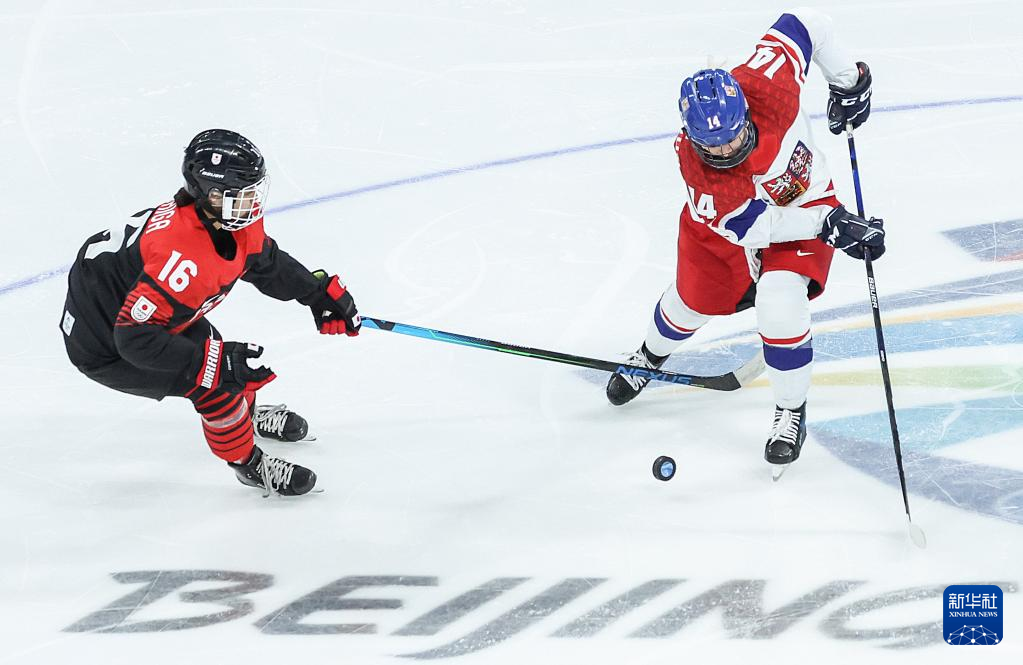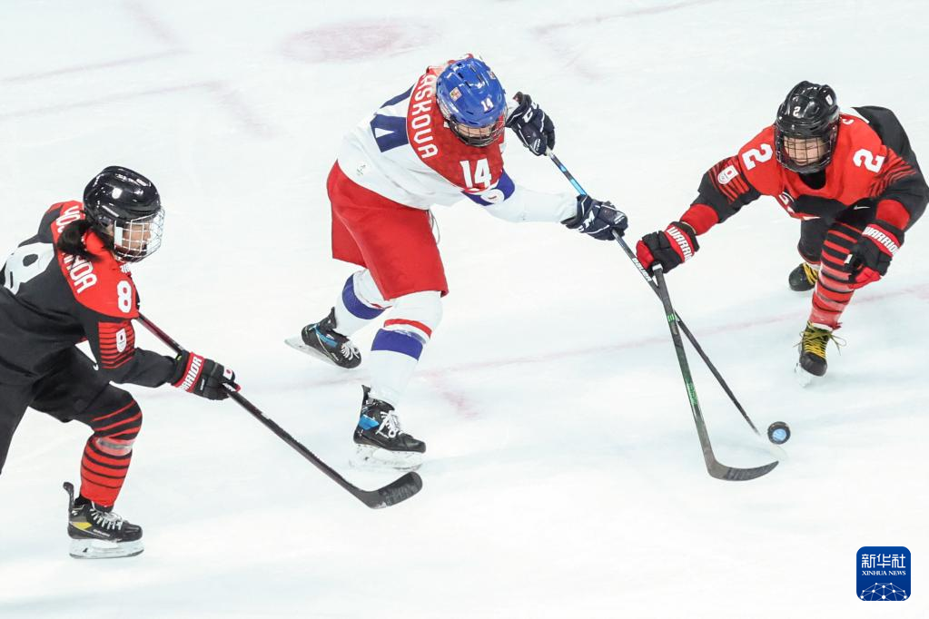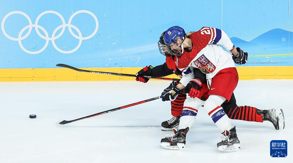 Athletes of Czech Republic compete during the ice hockey women's Group B match between Denmark and Czech Republic at Wukesong Sports Centre in Beijing, capital of China, Feb. 7, 2022. (Xinhua/Li Ran)