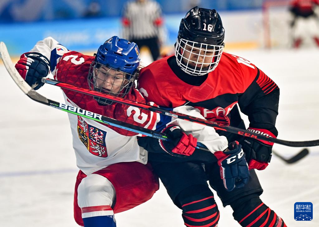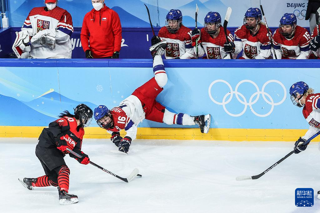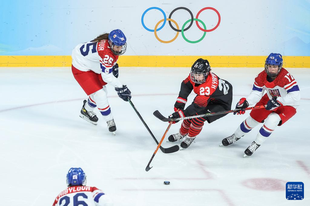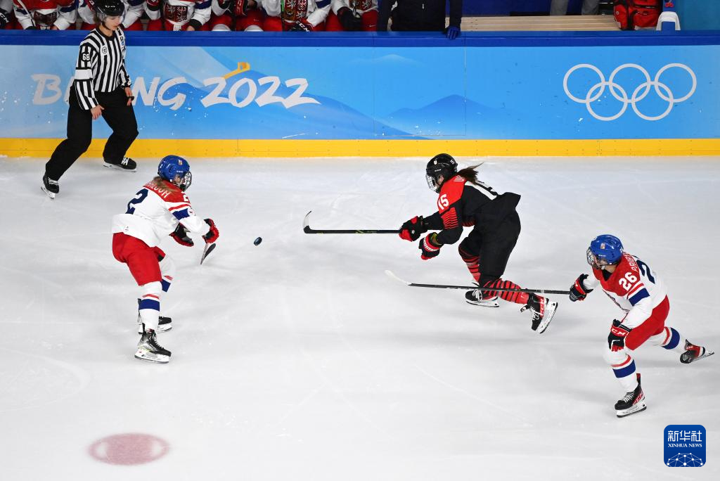 Athletes of Czech Republic compete during the ice hockey women's Group B match between Denmark and Czech Republic at Wukesong Sports Centre in Beijing, capital of China, Feb. 7, 2022. (Xinhua/Li Ran)