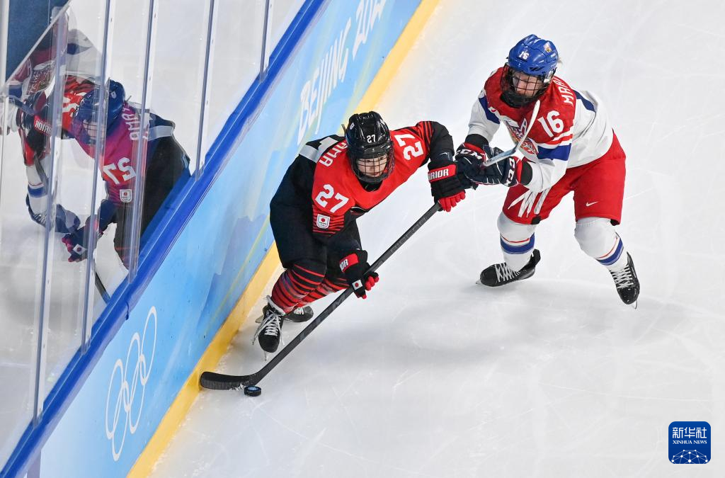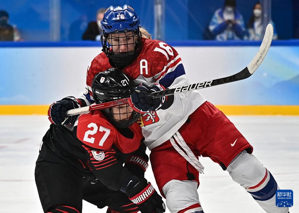 Denisa Krizova (R) of Czech Republic competes during the ice hockey women's Group B match between Japan and the Czech Republic at Wukesong Sports Centre in Beijing, capital of China, Feb. 8, 2022. (Xinhua/Song Yanhua)