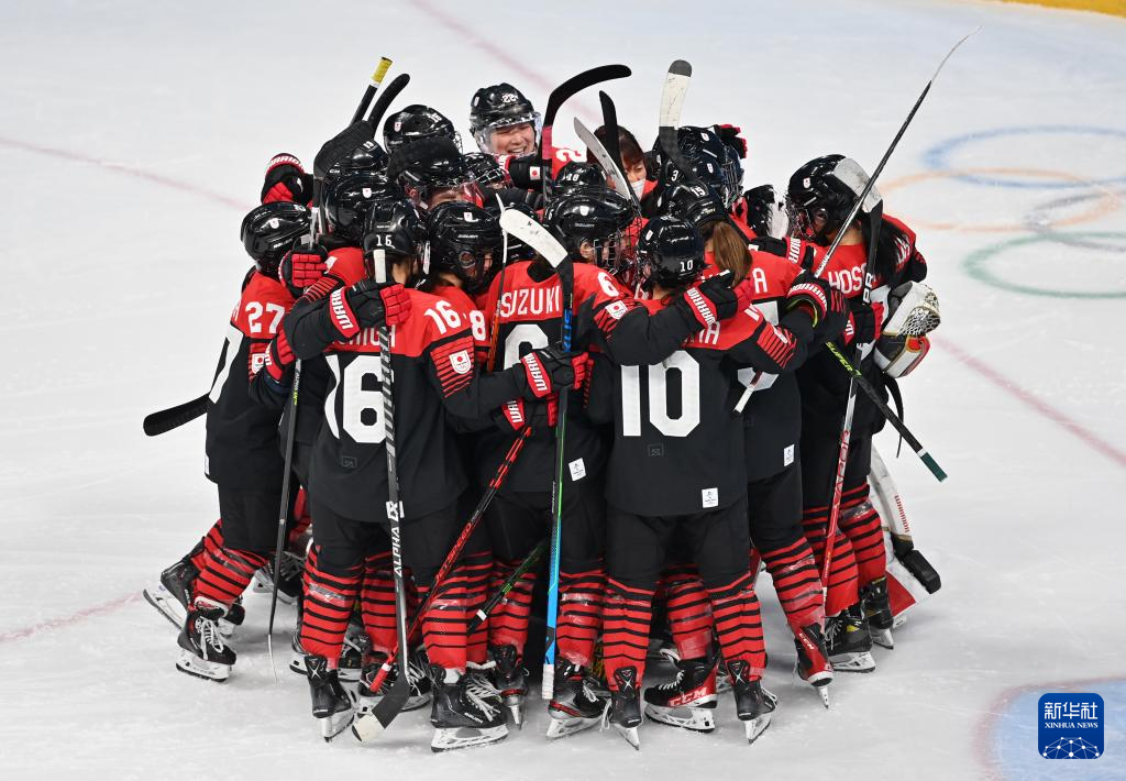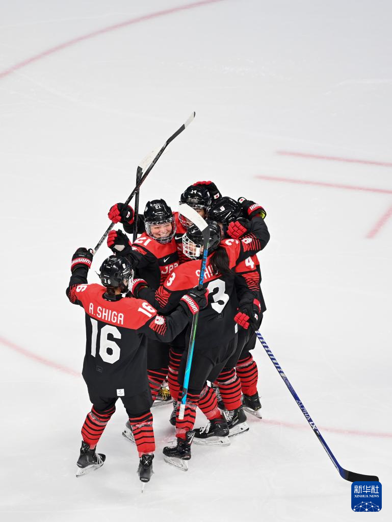 Athletes of Japan celebrate after Japan scoring a goal during the ice hockey women's preliminary round group B match between Japan and Czech Republic at Wukesong Sports Centre in Beijing, capital of China, Feb. 8, 2022. (Xinhua/Li Ran)