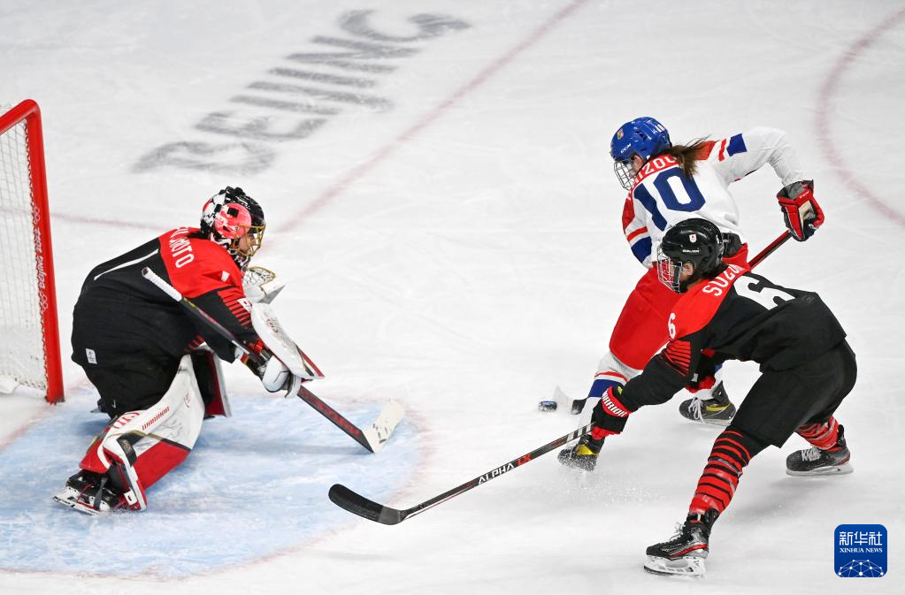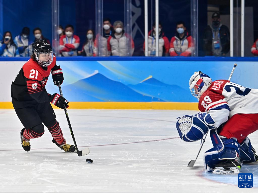 Kubo Hanae (L) of Japan goes for the net at penalty-shot shootout during the ice hockey women's Group B match between Japan and the Czech Republic at Wukesong Sports Centre in Beijing, capital of China, Feb. 8, 2022. (Xinhua/Song Yanhua)