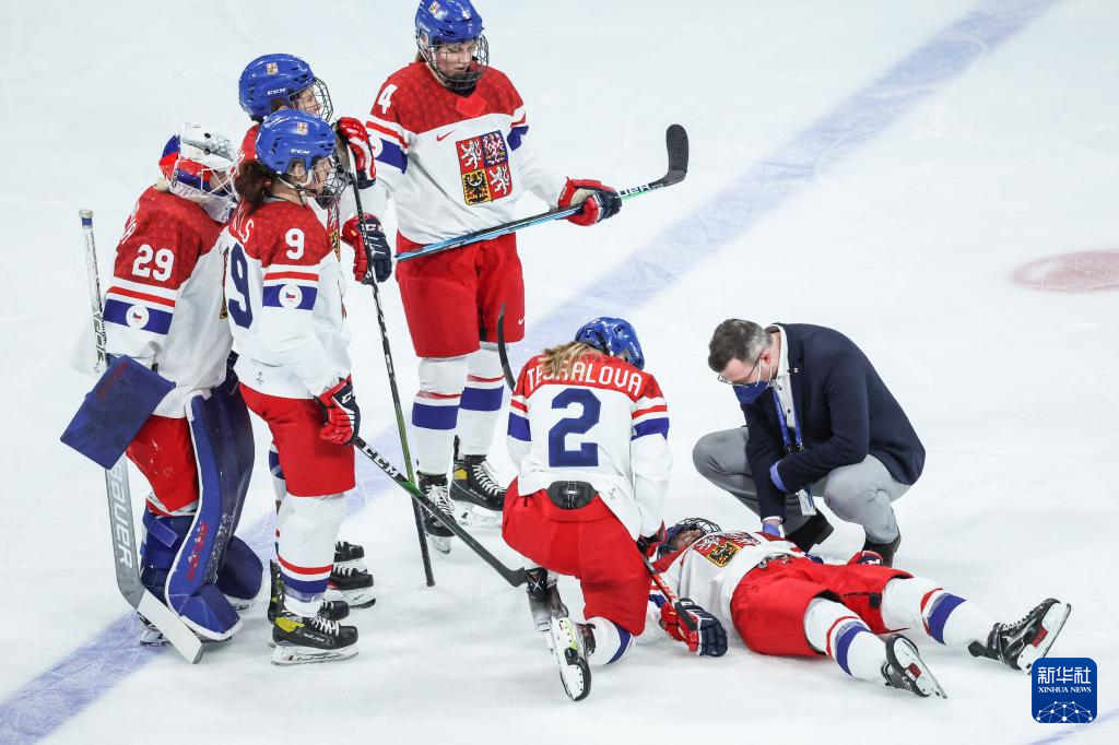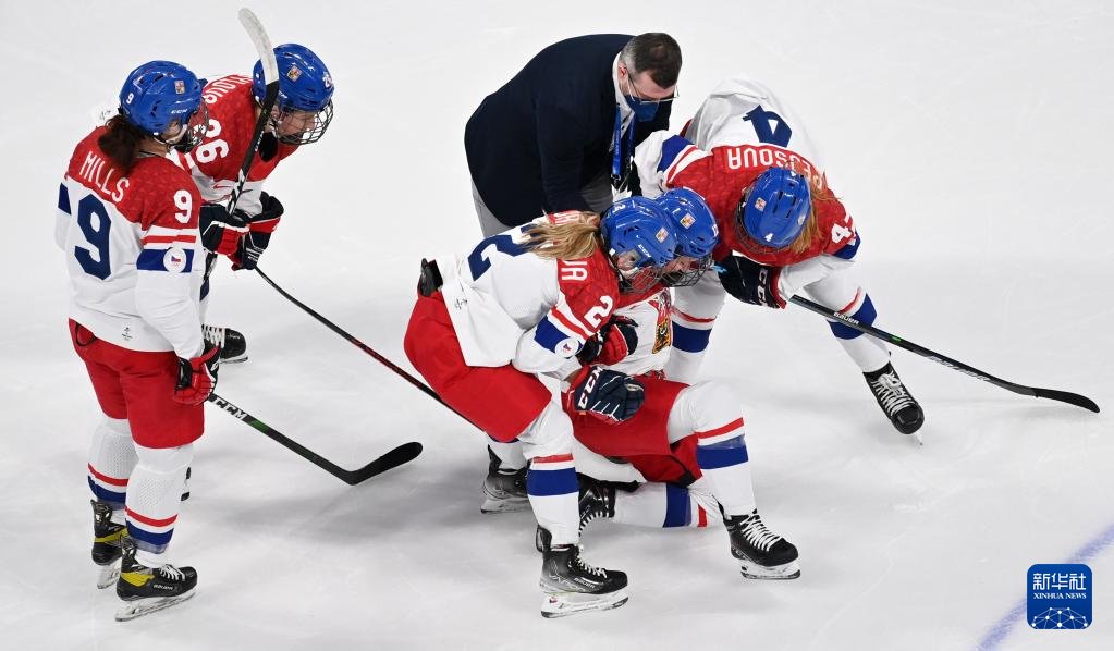 Athletes of Czech Republic help their teammates stand during the ice hockey women's Group B match between Denmark and Czech Republic at Wukesong Sports Centre in Beijing, capital of China, Feb. 7, 2022. (Xinhua/Li Ran)