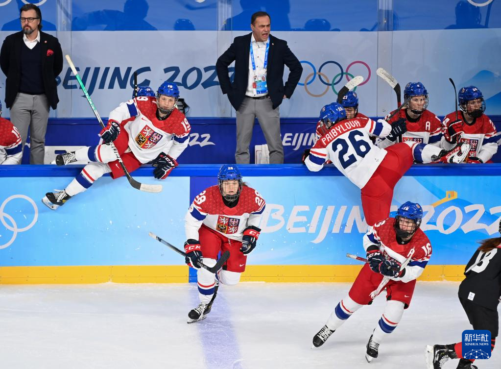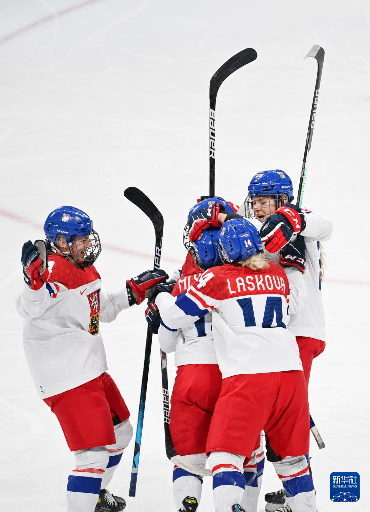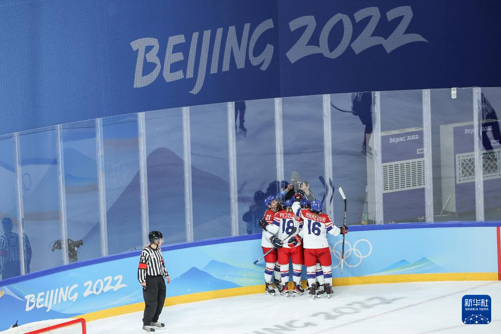 Athletes of Czech Republic celebrate during the ice hockey women's preliminary round group B match between Japan and Czech Republic at Wukesong Sports Centre in Beijing, capital of China, Feb. 8, 2022. (Xinhua/Zhang Yuwei)
