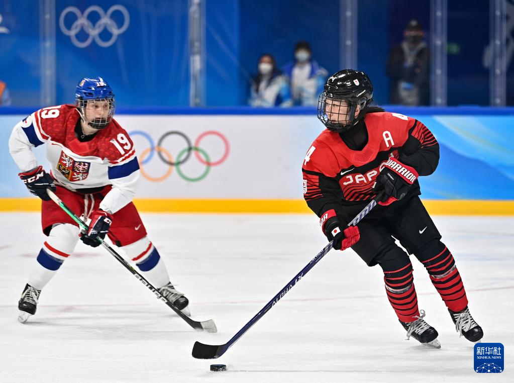 Toko Ayaka (R) of Japan competes during the ice hockey women's Group B match between Japan and the Czech Republic at Wukesong Sports Centre in Beijing, capital of China, Feb. 8, 2022. (Xinhua/Song Yanhua)