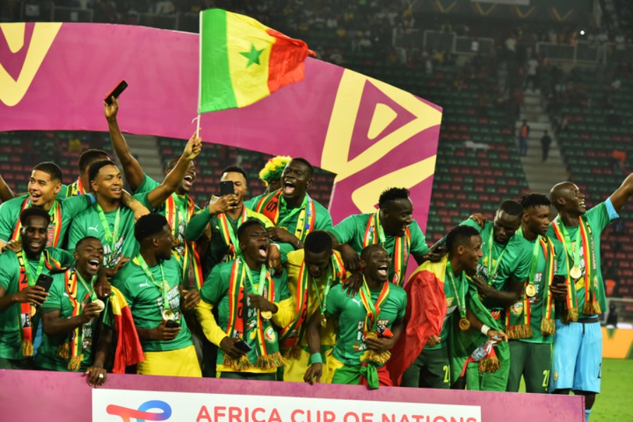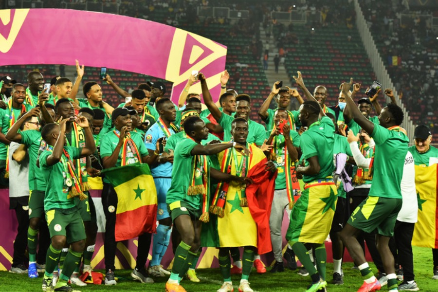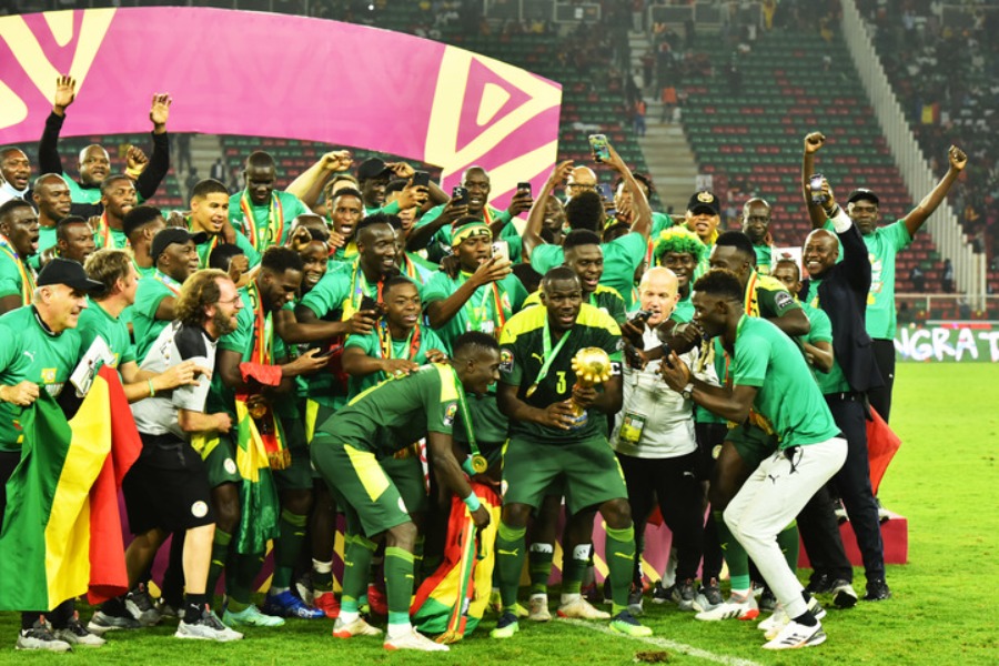 Players of Senegal celebrate winning the final match between Senegal and Egypt at 2021 Africa Cup of Nations (AFCON) in Yaounde, Cameroon, Feb. 6, 2022.(Xinhua/Kepseu)