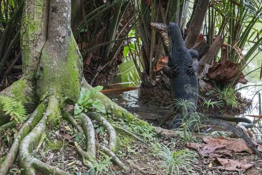 Two monitor lizards wrestle at Singapore Botanic Gardens on Feb. 7, 2022. (Photo by Then Chih Wey/Xinhua)
