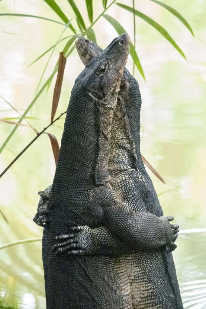 Two monitor lizards wrestle at Singapore Botanic Gardens on Feb. 7, 2022. (Photo by Then Chih Wey/Xinhua) ■