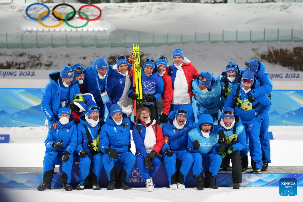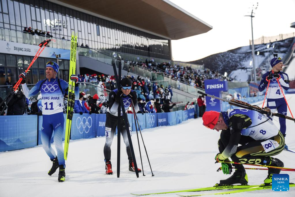 French athletes celebrate after biathlon men's 20km individual at National Biathlon Centre in Zhangjiakou, north China's Hebei Province, Feb. 8, 2022. (Xinhua/Peng Ziyang)