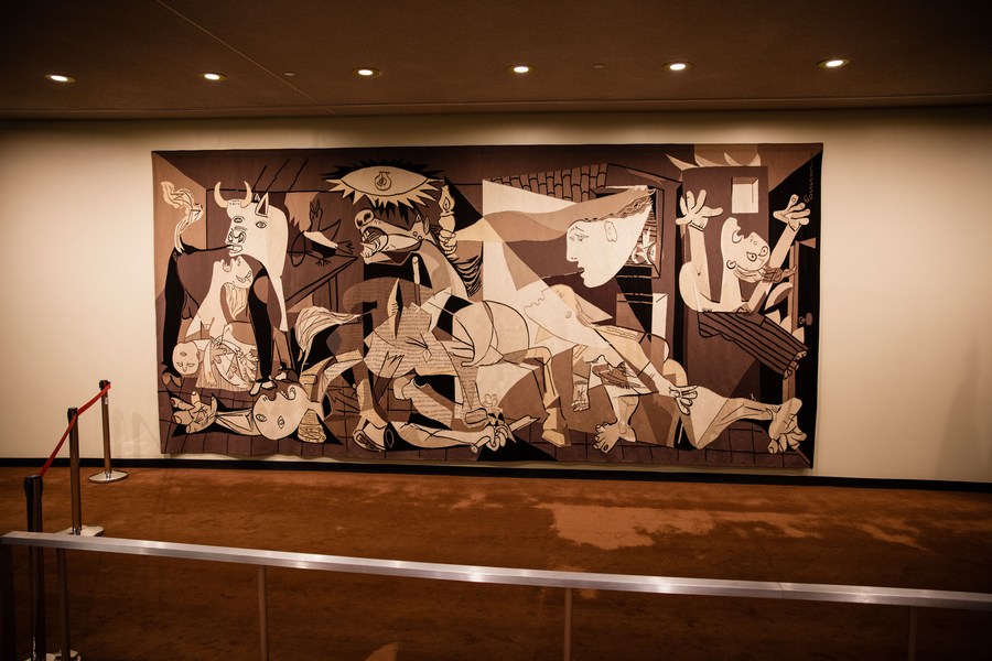 Pablo Picasso's "Guernica" tapestry is seen at the UN Headquarters in New York on Feb. 5, 2022. (Xinhua/Shang Xuqian)