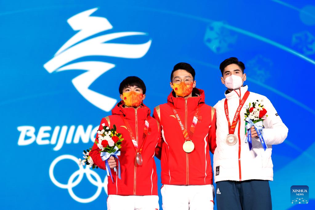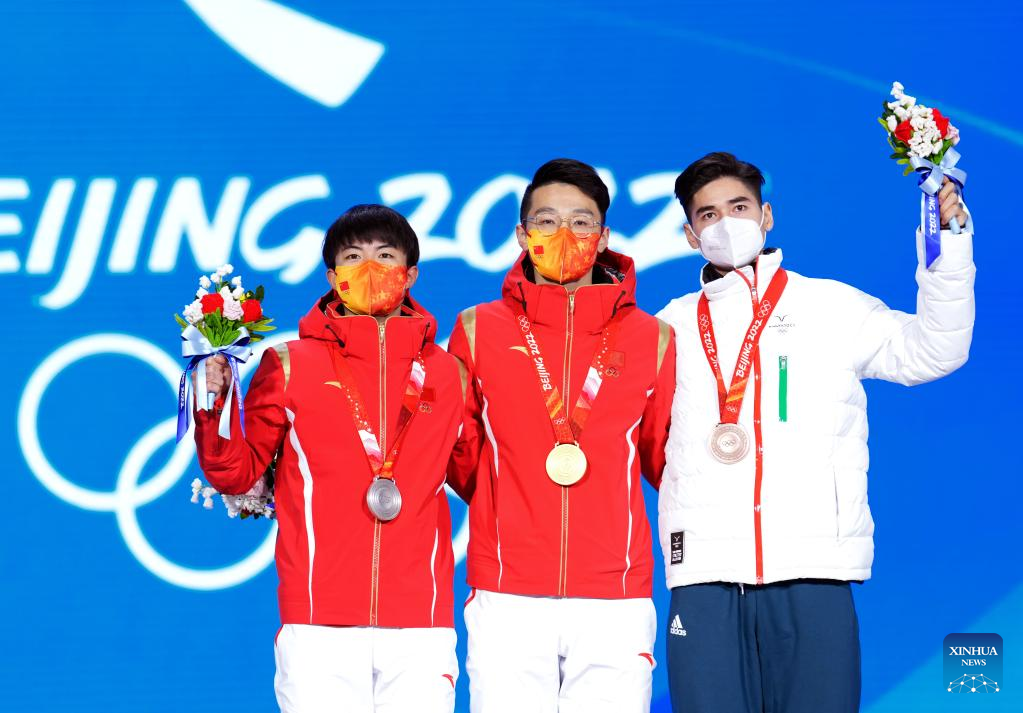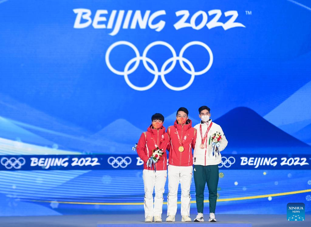 Gold medalist Ren Ziwei (C) of China, silver medalist Li Wenlong (L) of China and bronze medalist Shaoang Liu of Hungary pose for a photo during the awarding ceremony of men's 1000m of short track speed skating at the Beijing Medals Plaza of the Winter Olympics in Beijing, capital of China, Feb. 8, 2022. (Xinhua/Ju Huanzong)
