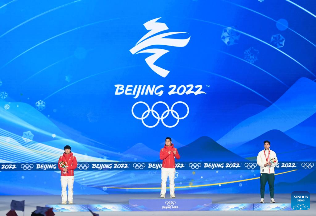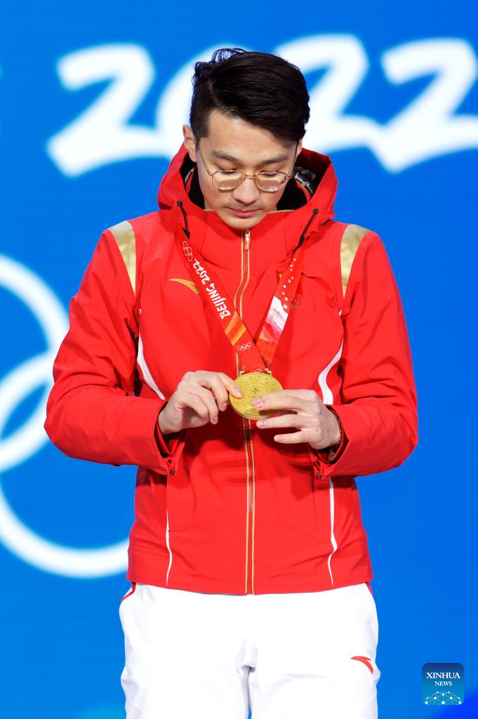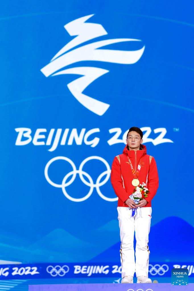 Gold medalist Ren Ziwei of China reacts during the awarding ceremony of men's 1000m of short track speed skating at the Beijing Medals Plaza of the Winter Olympics in Beijing, capital of China, Feb. 8, 2022. (Xinhua/Ju Huanzong)