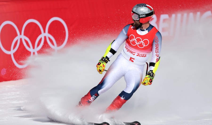 Travis Ganong of the United States competes during the Alpine Skiing Men's Super-G at the National Alpine Skiing Centre in Yanqing District, Beijing, capital of China, Feb. 8, 2022. (Xinhua/Chen Bin)