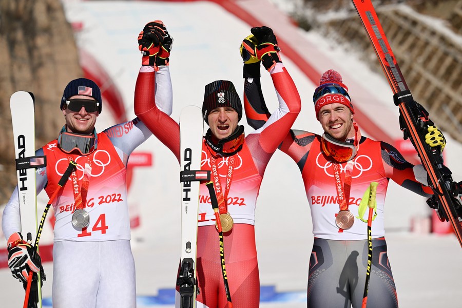 Matthias Mayer (C) of Austria, Ryan Cochran-Siegle (L) of the United States and Aleksander Aamodt Kilde of Norway celebrate during the awarding ceremony of Alpine Skiing Men's Super-G at National Alpine Skiing Centre in Yanqing District of Beijing, capital of China, Feb. 8, 2022. (Xinhua/Chen Bin)