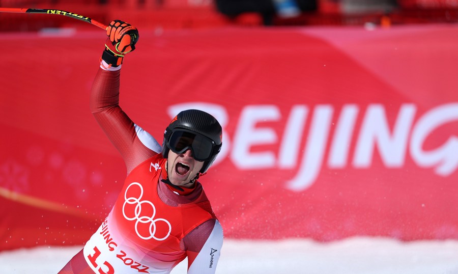 Matthias Mayer of Austria celebrates winning after the Alpine Skiing Men's Super-G match at the National Alpine Skiing Centre in Yanqing District, Beijing, capital of China, Feb. 8, 2022. (Xinhua/Chen Bin)
