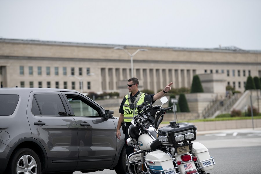A police officer works near the Pentagon in Arlington, Virginia, the United States, on Aug. 3, 2021. (Xinhua/Liu Jie)