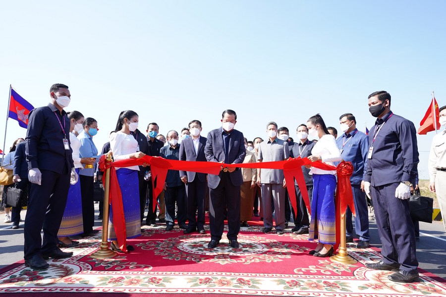 Cambodian Prime Minister Samdech Techo Hun Sen cuts the ribbon at the inauguration ceremony of the China-funded stretch of National Road No. 7 in Kratie province, Cambodia, Feb. 7, 2022. (Photo by Ly Lay/Xinhua)