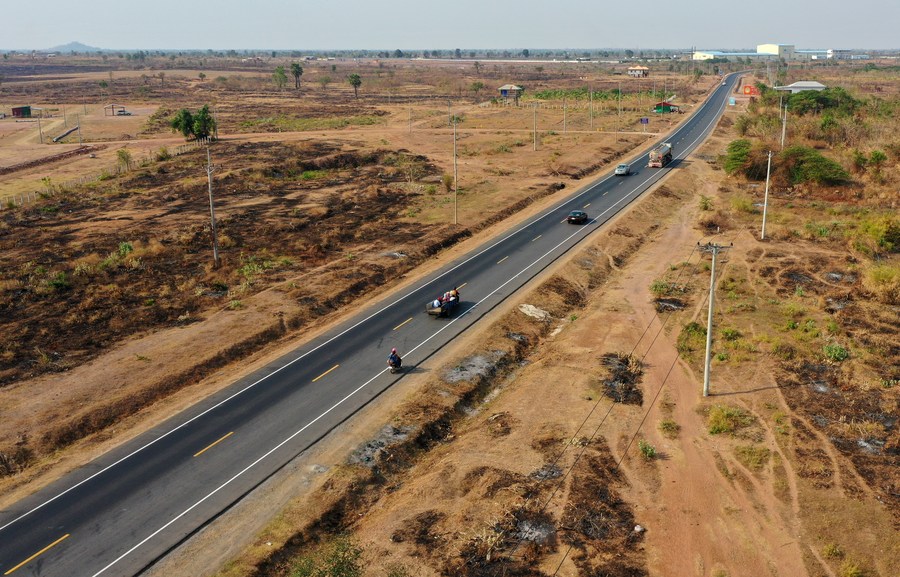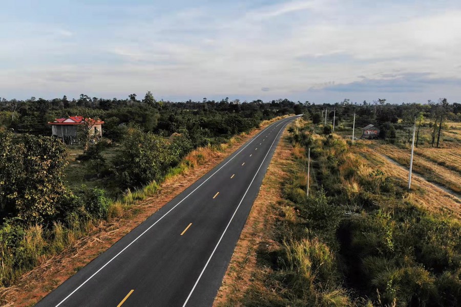 Aerial photo taken on Feb. 6, 2022 shows the China-funded stretch of National Road No. 7 in Kratie province, Cambodia. (Photo by Ly Lay/Xinhua)