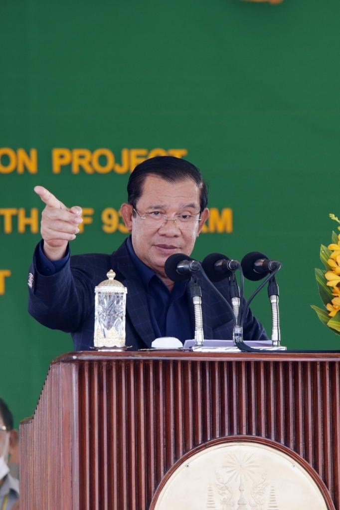 Cambodian Prime Minister Samdech Techo Hun Sen speaks at the inauguration ceremony of the China-funded stretch of National Road No. 7 in Kratie province, Cambodia, Feb. 7, 2022. (Photo by Ly Lay/Xinhua)