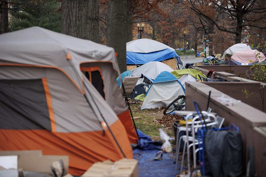 Tents of the homeless are seen in Washington, D.C., the United States, Dec. 8, 2021. (Photo by Ting Shen/Xinhua)