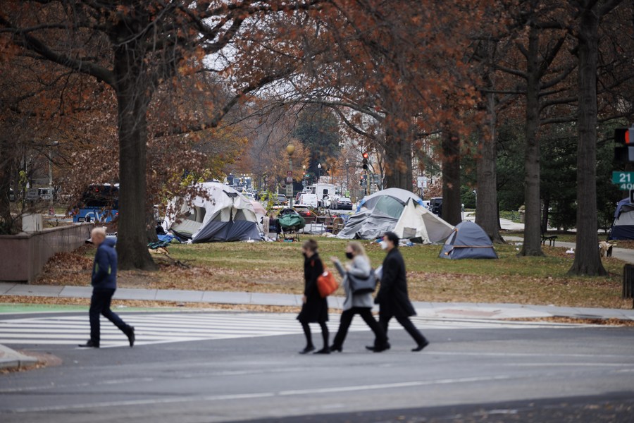 People pass by tents of the homeless in Washington, D.C., the United States, Dec. 8, 2021. (Photo by Ting Shen/Xinhua)