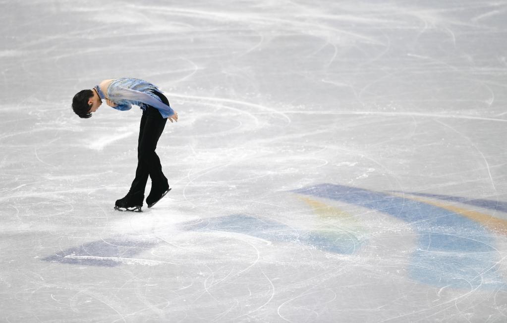 Hanyu Yuzuru of Japan prepares prior to the figure skating men single skating short program at Capital Indoor Stadium in Beijing, capital of China, Feb. 8, 2022. (Xinhua/Cao Can)