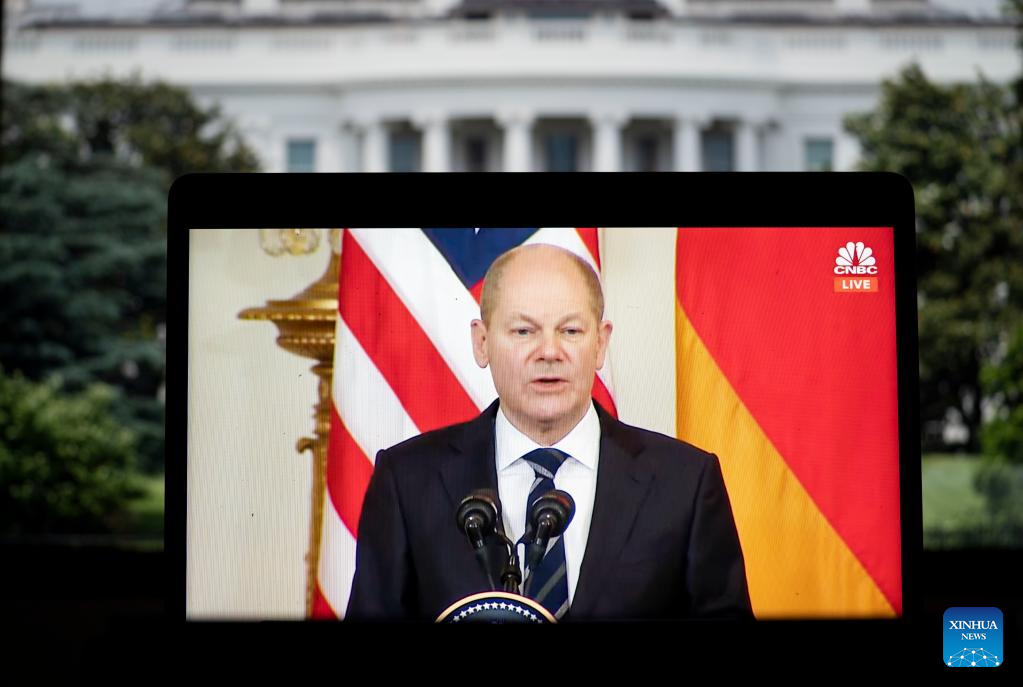 Photo taken in Arlington of Virginia, the United States, shows a screen displaying German Chancellor Olaf Scholz and U.S. President Joe Biden (not pictured) attending a press conference at the White House in Washington, D.C. Feb. 7, 2022. Joe Biden told the press conference that if Russian tanks and troops cross the border and enter Ukraine, "there will be no longer Nord Stream 2," referring to the now-finished pipeline delivering natural gas from Russia to Germany through Ukraine. (Xinhua/Liu Jie)