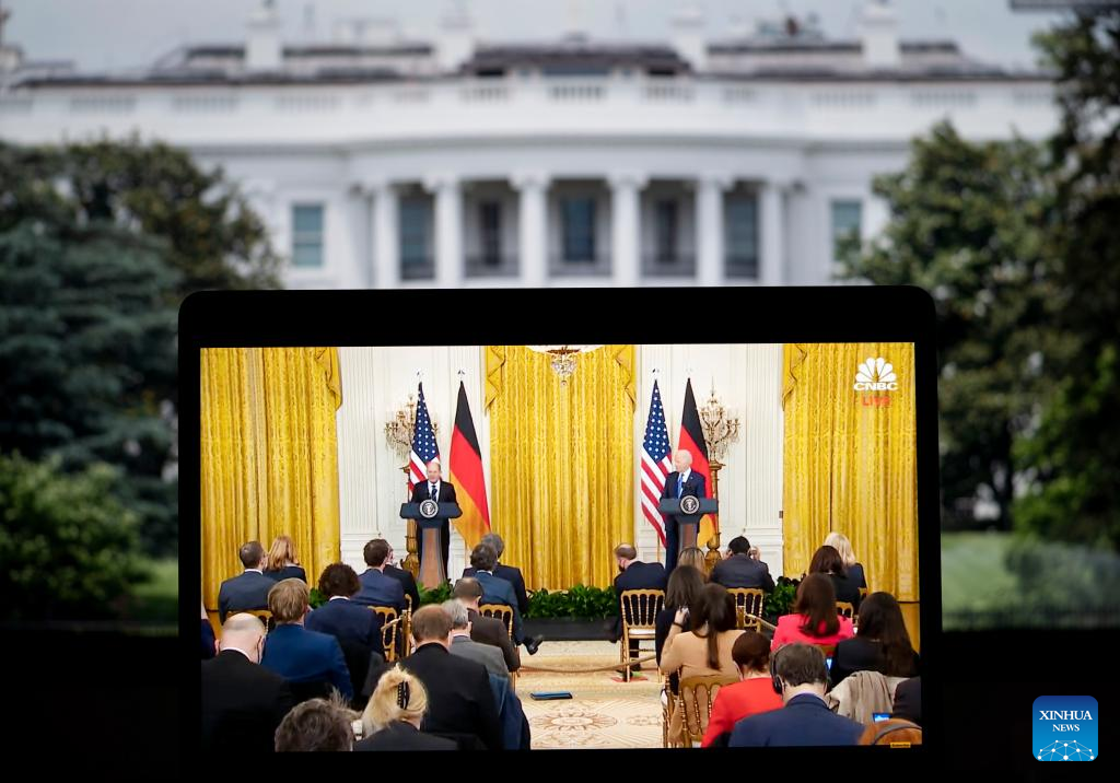 Photo taken in Arlington of Virginia, the United States, shows a screen displaying U.S. President Joe Biden and German Chancellor Olaf Scholz (not pictured) attending a press conference at the White House in Washington, D.C. Feb. 7, 2022. Joe Biden told the press conference that if Russian tanks and troops cross the border and enter Ukraine, "there will be no longer Nord Stream 2," referring to the now-finished pipeline delivering natural gas from Russia to Germany through Ukraine. (Xinhua/Liu Jie)
