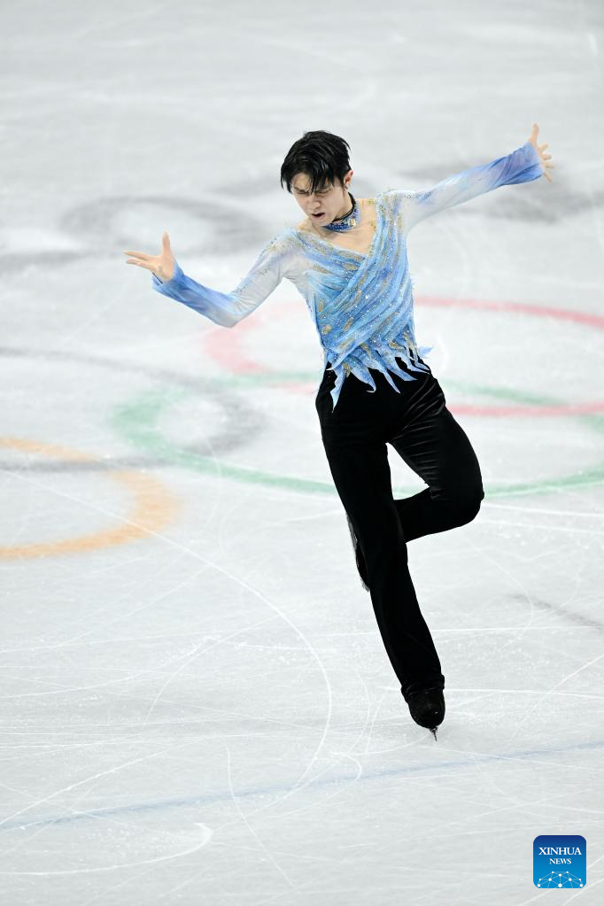Hanyu Yuzuru of Japan performs during the figure skating men single skating short program at Capital Indoor Stadium in Beijing, capital of China, Feb. 8, 2022. (Xinhua/Liu Xiao)
