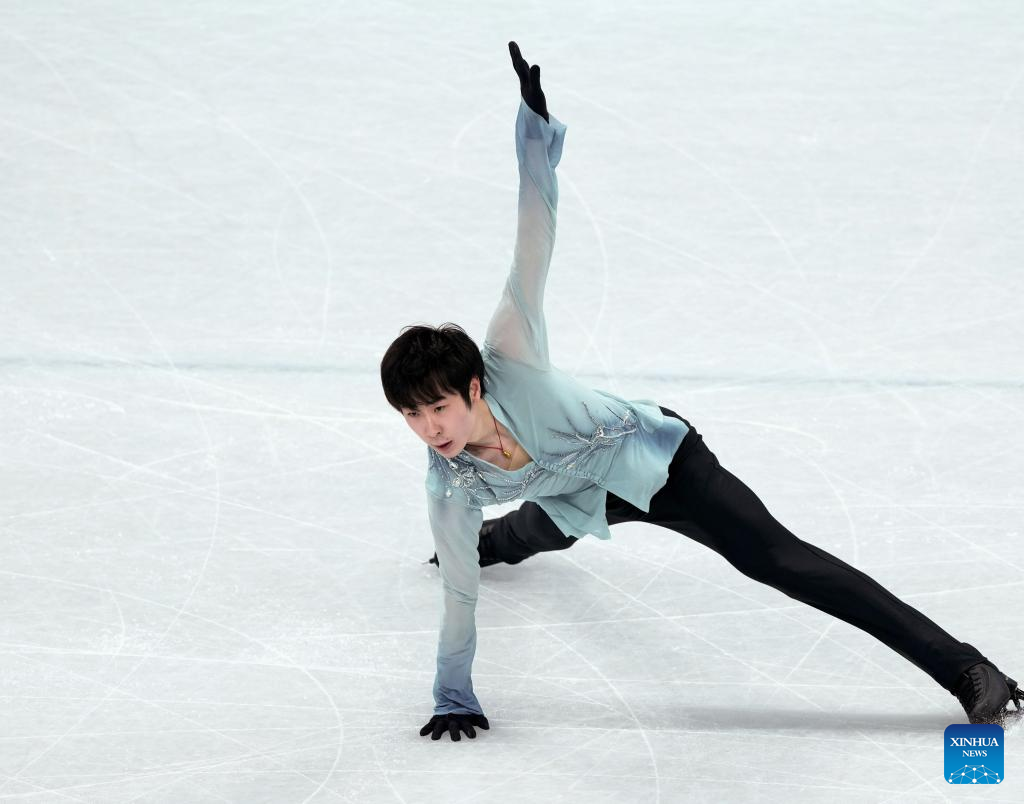 Uno Shoma of Japan performs during the figure skating men single skating short program at Capital Indoor Stadium in Beijing, capital of China, Feb. 8, 2022. (Xinhua/Cao Can)