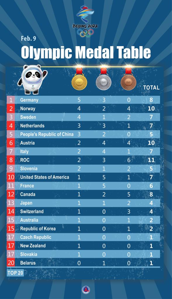 BEIJING, Feb. 9 (Xinhua) -- Following is the medal table at the 2022 Beijing Winter Olympics on Feb. 9.