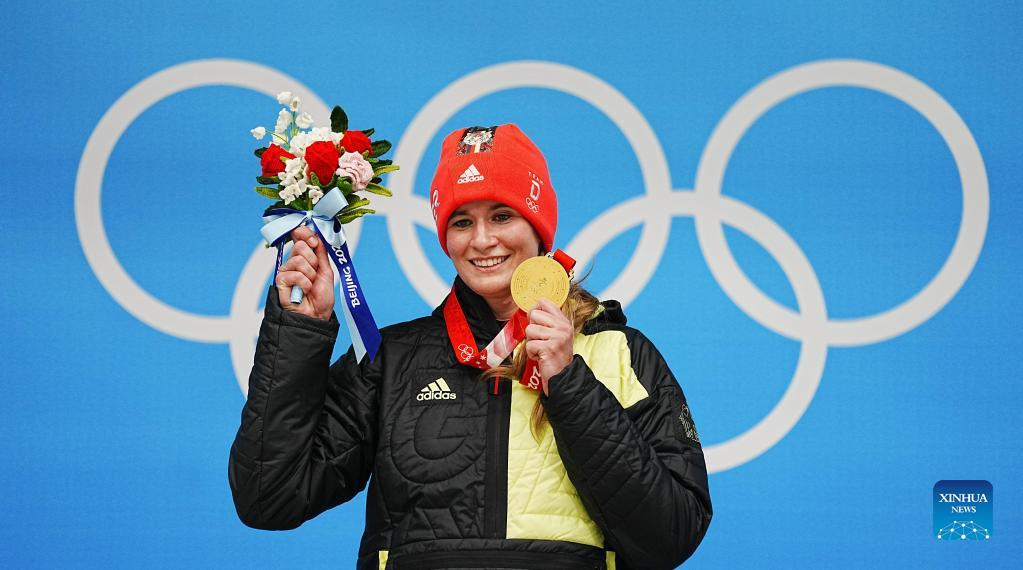 Gold medallist Natalie Geisenberger of Germany attends the awarding ceremony after women's singles run of luge event at the Yanqing National Sliding Centre in Yanqing district of Beijing, capital of China, Feb. 8, 2022. (Xinhua/Jiang Wenyao)