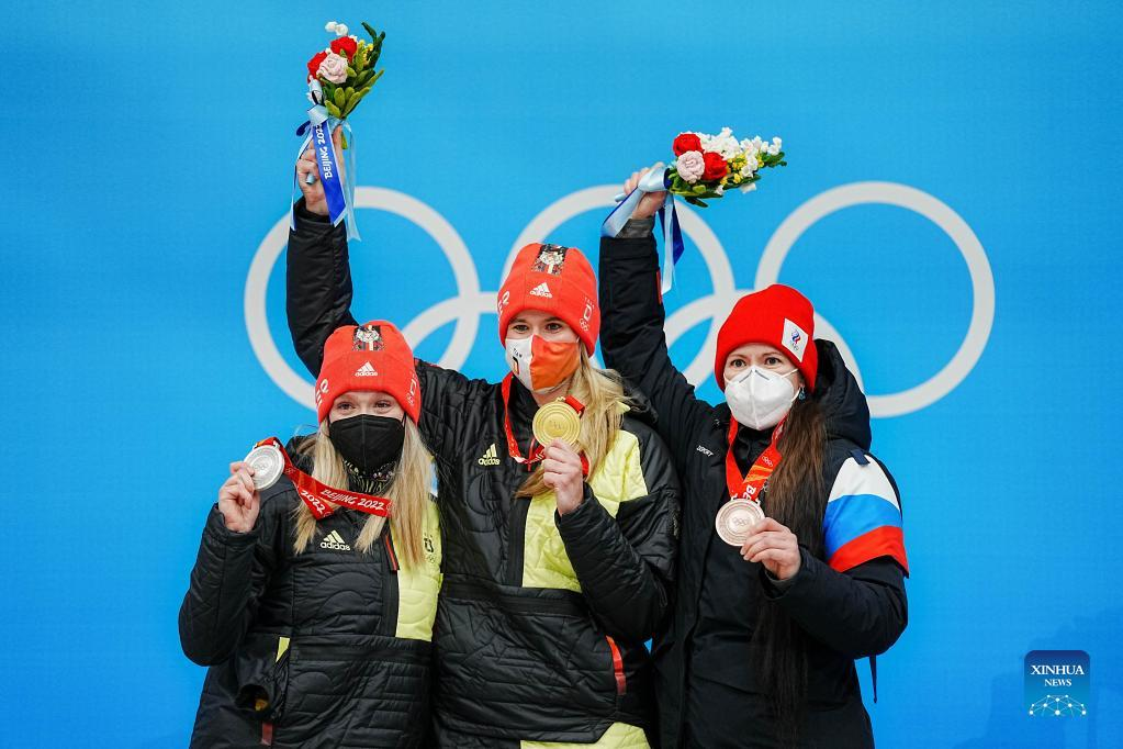 Gold medallist Germany's Natalie Geisenberger (C), Silver medallist Germany's Anna Berreiter (L) and Bronze medallist ROC's Tatyana Ivanova attend the awarding ceremony after women's singles run of luge event at the Yanqing National Sliding Centre in Yanqing district of Beijing, capital of China, Feb. 8, 2022. (Xinhua/Jiang Wenyao)