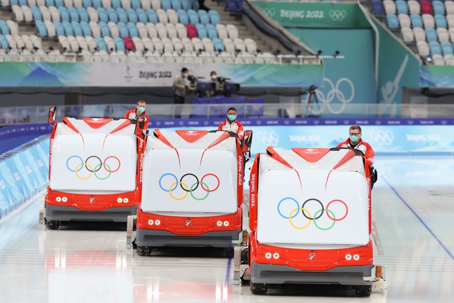 Staff members work on the ice rink before the women's 3,000m final of speed skating at the National Speed Skating Oval in Beijing, capital of China, Feb. 5, 2022. (Xinhua/Cheng Tingting)