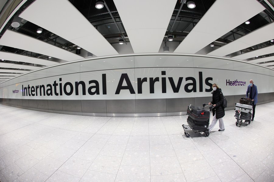 A picture taken with a fish-eye lens shows passengers walking in Terminal 5 at Heathrow Airport in London, Britain, Jan. 7, 2022. (Photo by Tim Ireland/Xinhua)