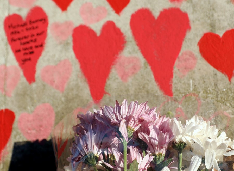 Photo taken on Jan. 13, 2022 shows flowers beside the National COVID Memorial Wall on the south bank of the Thames River in London, Britain. (Xinhua/Li Ying)