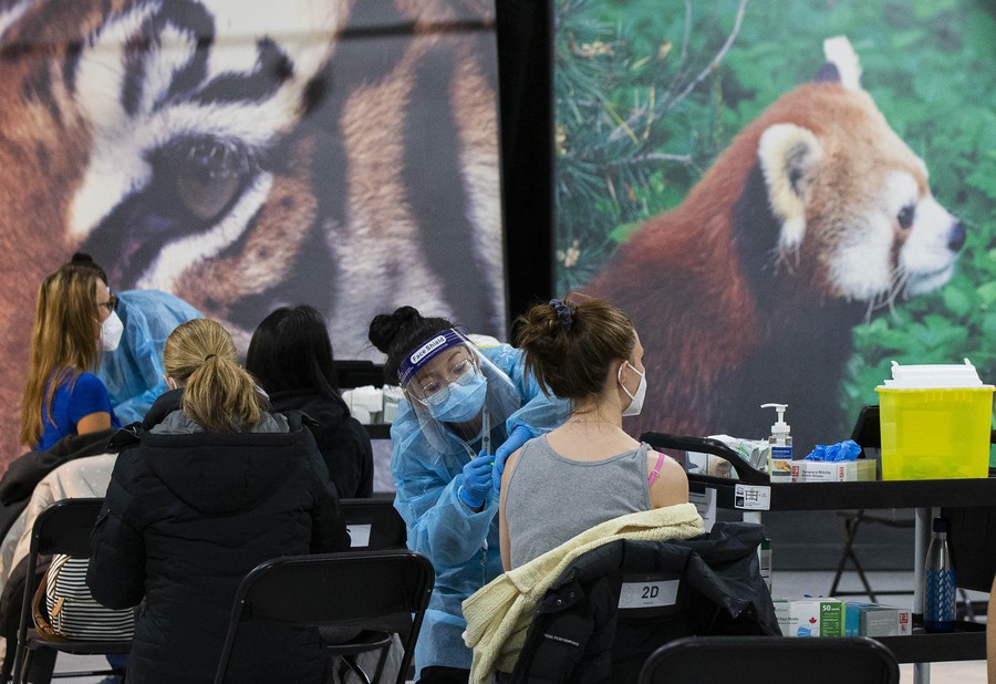 A health worker wearing personal protective equipment administers a dose of COVID-19 vaccine to a woman at a COVID-19 vaccination clinic at the Toronto Zoo in Toronto, Ontario, Canada, on Jan. 12, 2022. (Photo by Zou Zheng/Xinhua)