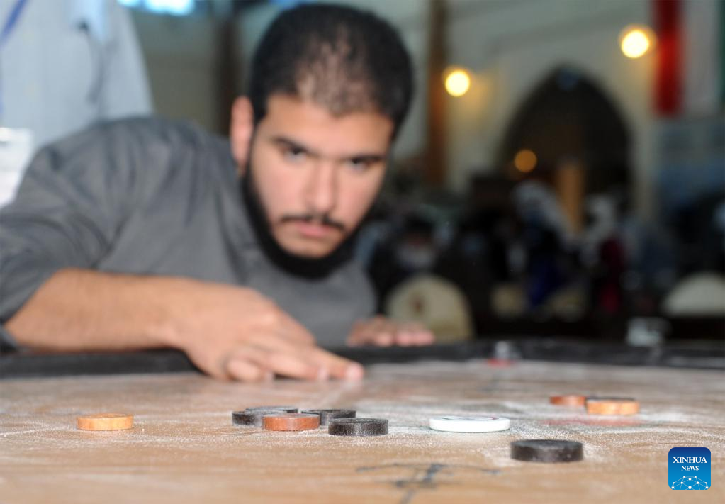 A player participates in the first national carrom championship in Hawalli Governorate, Kuwait, Feb. 8, 2022. Kuwait holds the first national carrom championship from Feb. 8 to 10 in Hawalli Governorate. (Photo by Asad/Xinhua)