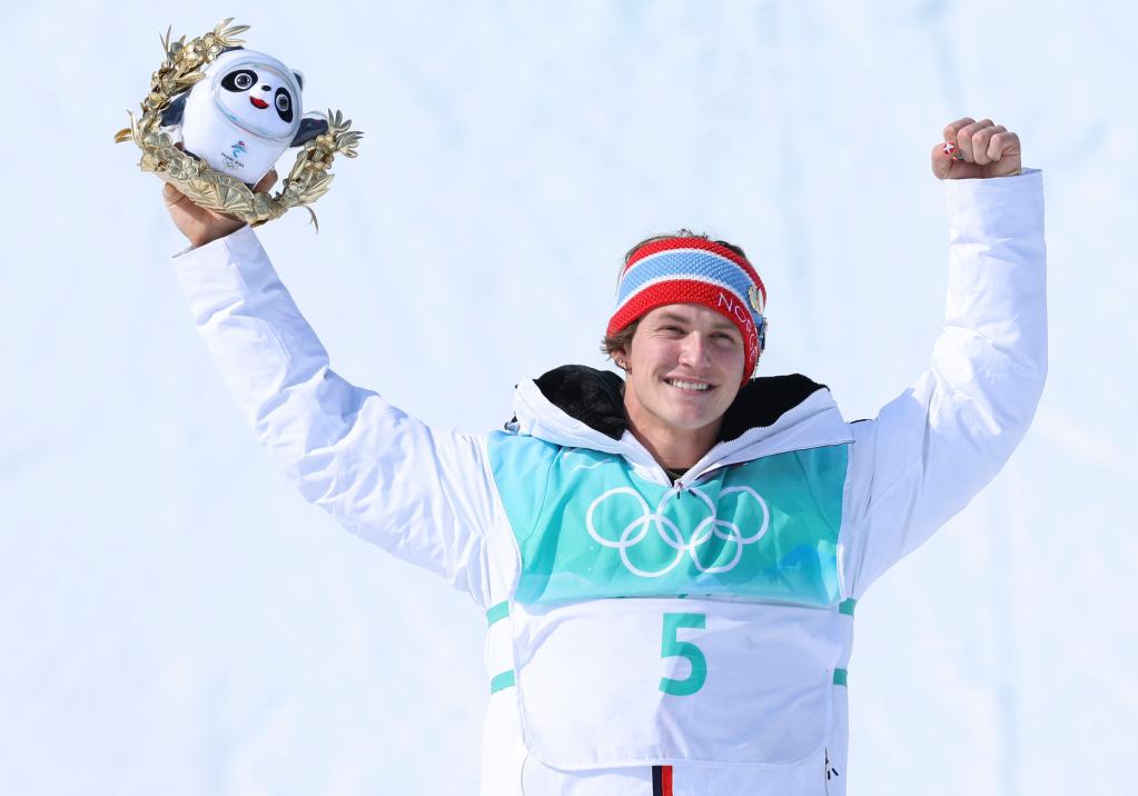 Birk Ruud of Norway celebrates during the flower ceremony after the freestyle skiing men's freeski big air final of Beijing 2022 Winter Olympics at Big Air Shougang in Beijing, capital of China, Feb. 9, 2022. (Xinhua/Wang Jingqiang)