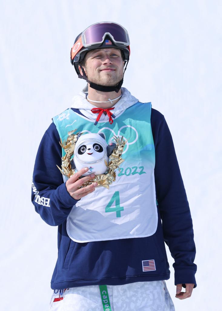 Silver medalist Colby Stevenson of the United States is seen during the flower ceremony after the freestyle skiing men's freeski big air final of Beijing 2022 Winter Olympics at Big Air Shougang in Beijing, capital of China, Feb. 9, 2022. (Xinhua/Wang Jingqiang)