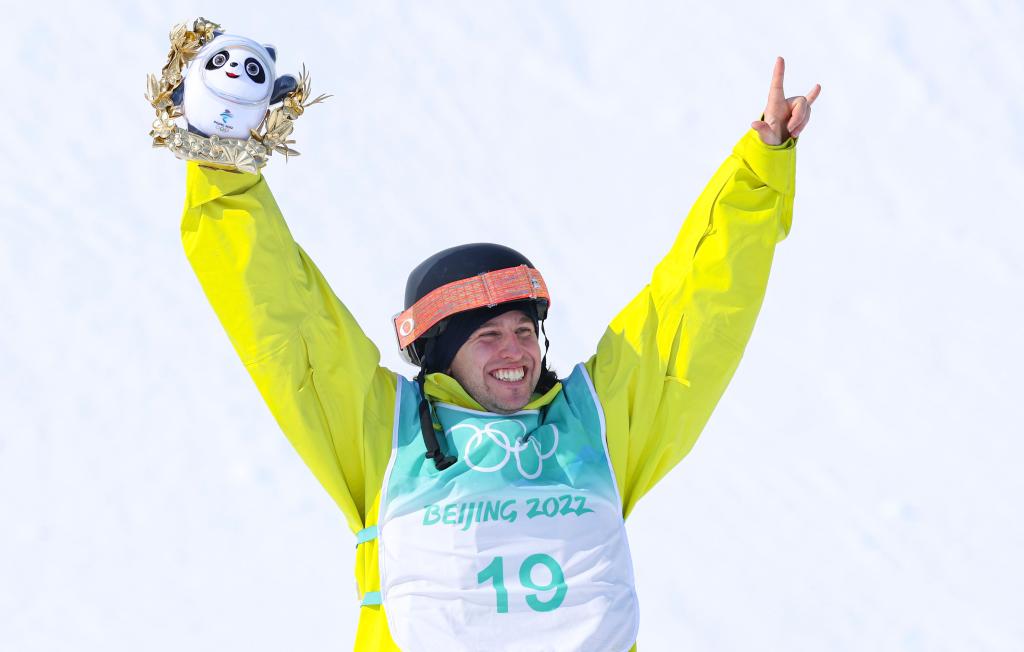 Henrik Harlaut of Sweden reacts during the flower ceremony after the freestyle skiing men's freeski big air final of Beijing 2022 Winter Olympics at Big Air Shougang in Beijing, capital of China, Feb. 9, 2022. (Xinhua/Wang Jingqiang)