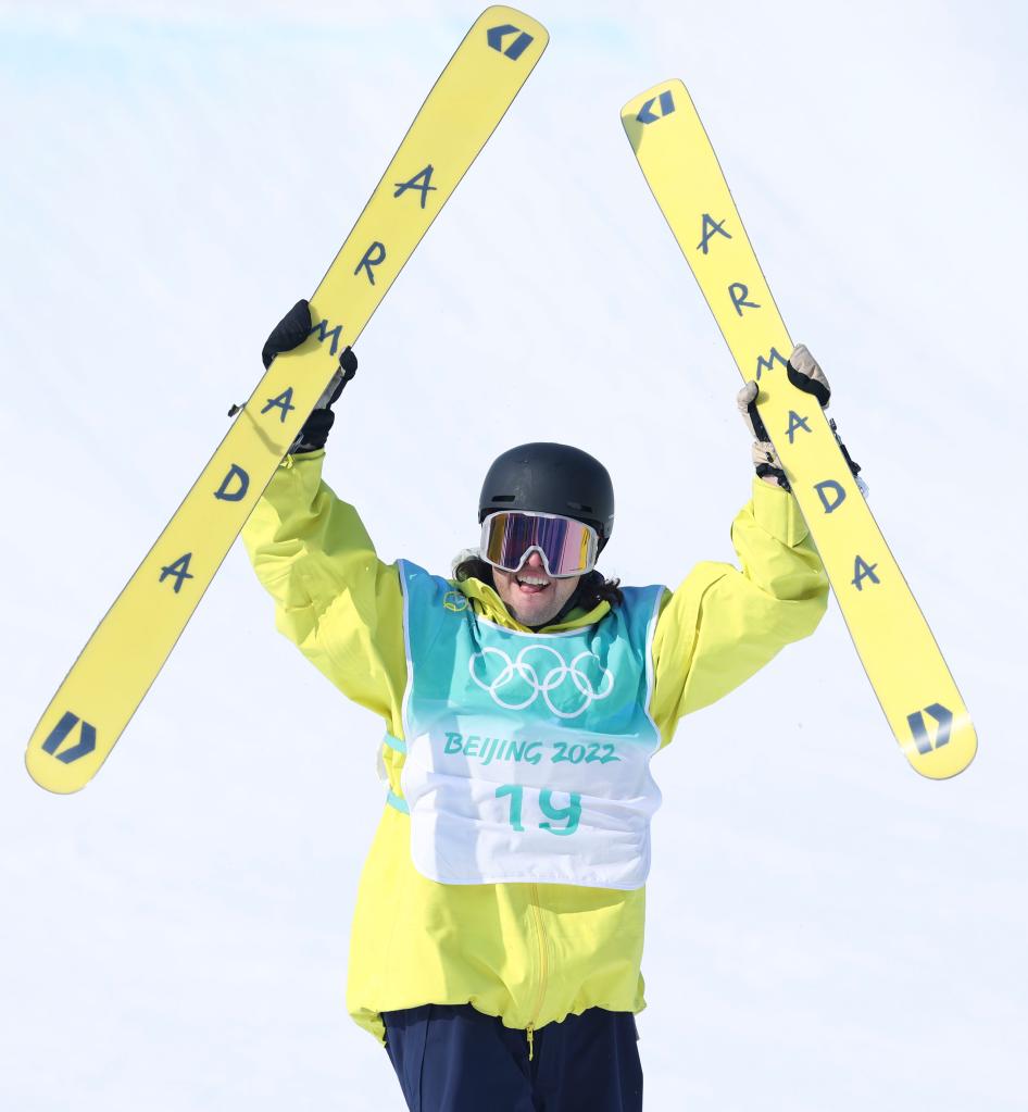 Henrik Harlaut of Sweden celebrates after the freestyle skiing men's freeski big air final at Big Air Shougang in Beijing, capital of China, Feb. 9, 2022. (Xinhua/Wang Jingqiang)
