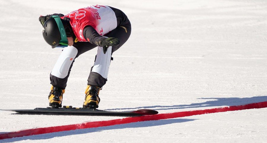 CHONGLI, Zhangjiakou, Feb. 9 (Xinhua) -- Carrying her snowboard, Gong Naiying stopped in a corner before passing through the mixed zone, looking at the big screen while her opponents were sliding down the hillside.