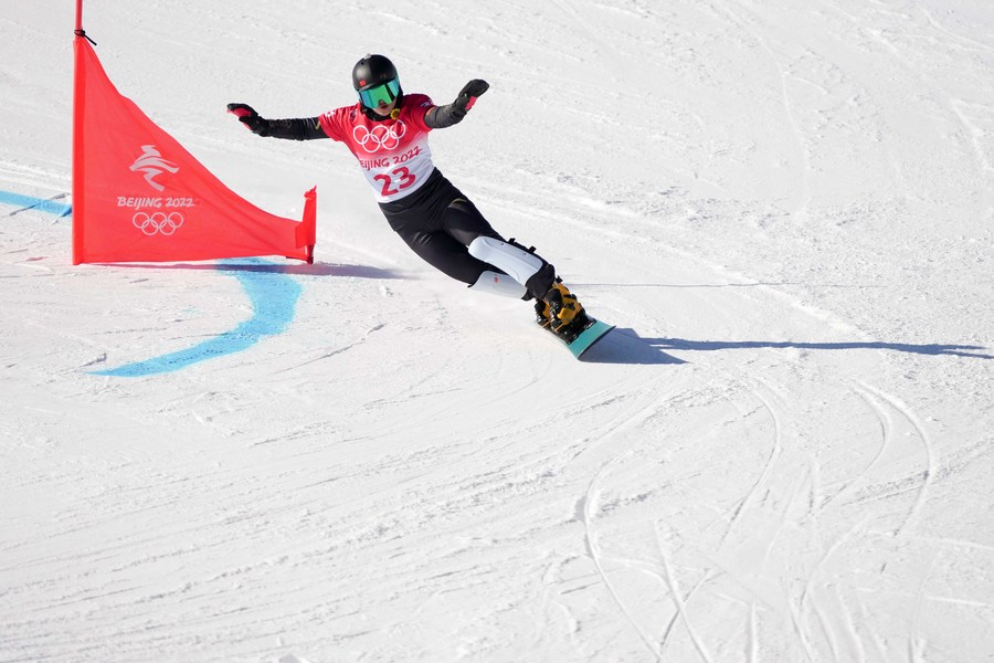 Gong Naiying of China competes during snowboard women's parallel giant slalom qualification at the Genting Snow Park in Zhangjiakou, north China's Hebei Province, Feb. 8, 2022. (Xinhua/Wang Haofei)