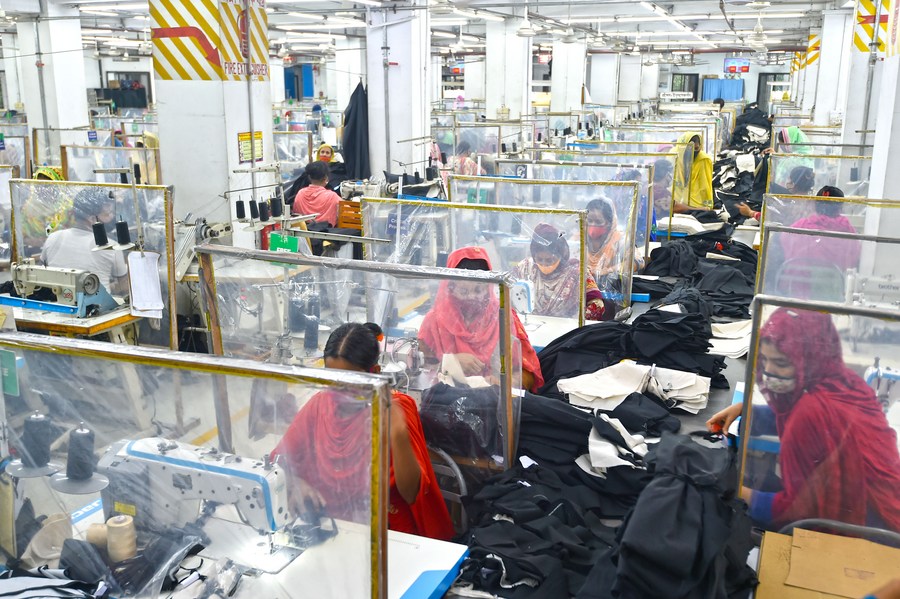 Photo taken on Aug. 23, 2021 shows sewing desks with plastic curtains installed to maintain social distancing for workers at a garment factory in Dhaka, Bangladesh. (Xinhua)