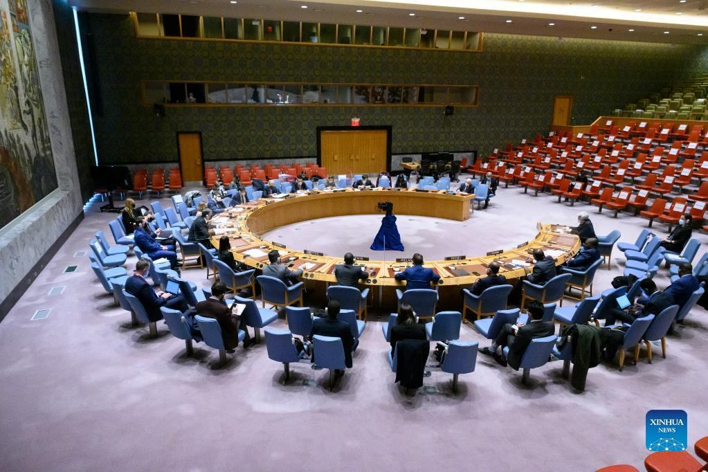 Photo taken on Feb. 9, 2022 shows a UN Security Council meeting on Threats to International Peace and Security Caused by Terrorist Acts at the UN headquarters in New York. (Loey Felipe/UN Photo/Handout via Xinhua)
